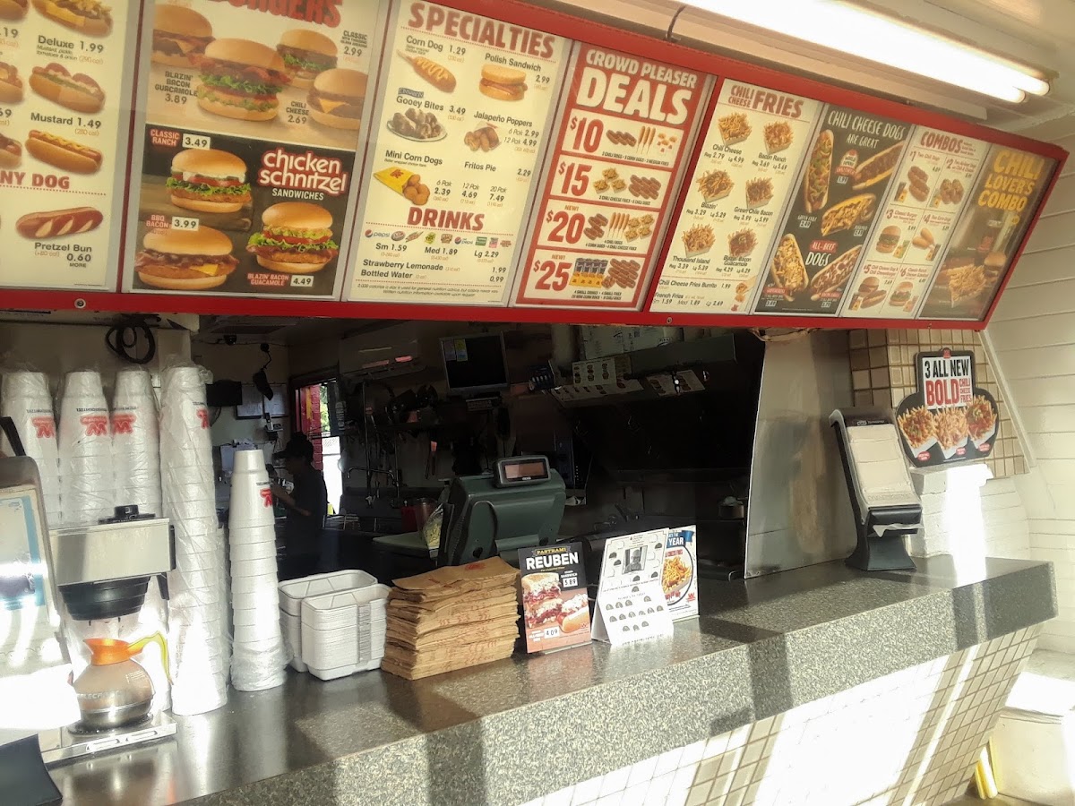 The star of the menu includes hot dogs served on freshly steamed buns, featuring options like the classic Mustard Dog and the indulgent Chili Cheese Dog topped with their rich secret chili sauce. Don’t miss the Corn Dog, lightly battered and fried to perfection. For sides, the Chili Cheese Fries and creamy Ranch Dressing complement the main dishes beautifully.